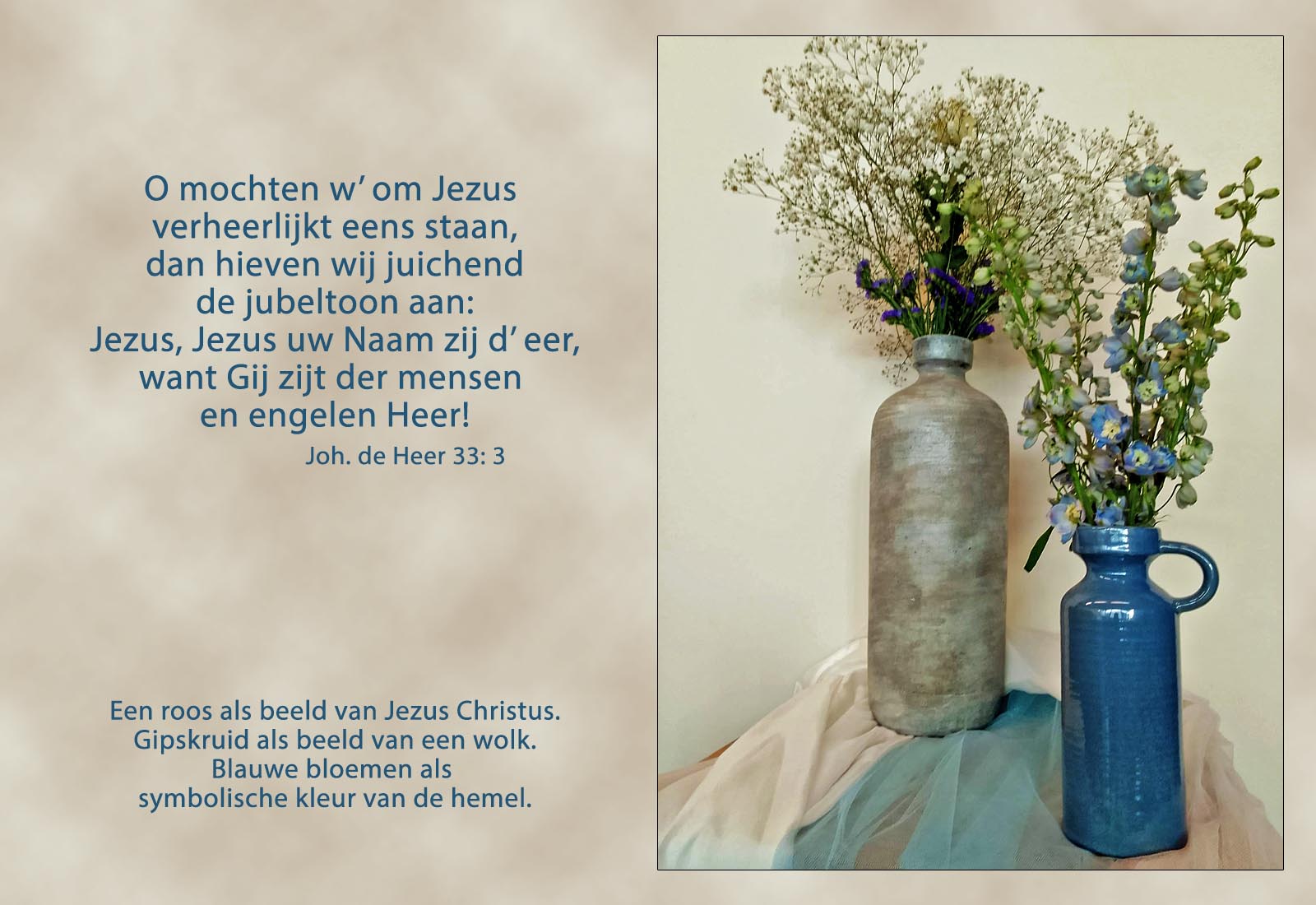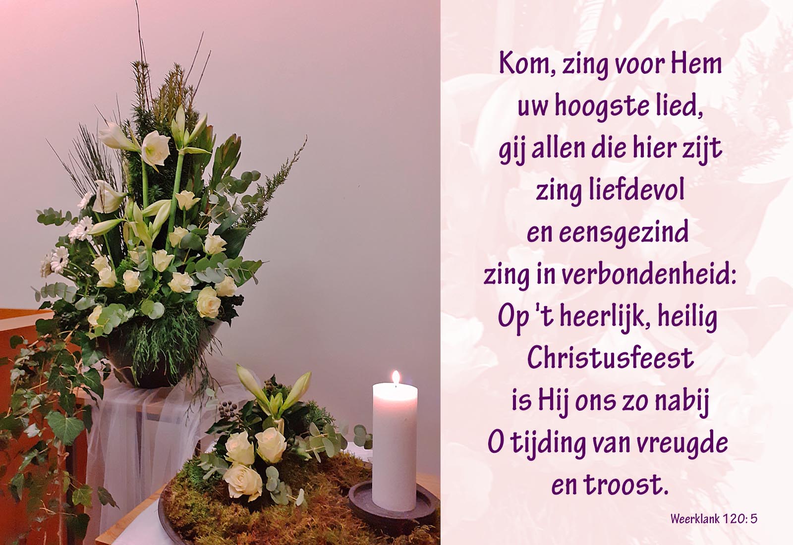 Schikking op 1e Advent 2023 ![]() Schikkingen in de Hoeksteen en Vredeskerk op eeuwigheidszondag 2023 ![]() ![]() ![]() Bloemschikking op Pinksteren 2023 ![]() Bloemschikking op Hemelvaartsdag 2023 ![]() Bloemschikking rond lijdenstijd en Pasen 2023 ![]() Paasdagen ![]() Goede Vrijdag ![]() Witte donderdag ![]() ![]() Bloemschikking in de Vredeskerk Wezep met Kerst 2022 ![]() ![]() Bloemschikking in de Vredeskerk Wezep 4e advent. ![]() ![]() Bloemschikking in de Vredeskerk Wezep 3e advent. ![]() ![]() Bloemschikking in de Vredeskerk Wezep 2e advent. ![]() ![]() Bloemschikking in de Vredeskerk Wezep 1e advent. ![]() Eeuwigheidszondag 2022 Centraal in de schikking een grote witte steen – 'Ik zal hem een witte steen geven.' (Openbaring 2:17) Eén witte lelie – 'O lelie die mijn hart bekoort.' (LvdK 157:2) De witte gerbera’s verwijzen naar het hemels manna. Zeven witte rozen, de zeven gemeenten, als ook het getal van de volheid. De schikking is omringd met ranken. Hoe groei ik in uw lichte schijn, hoe bloei ik op, daar ik mag zijn, een rank met U verweven. (LvdK 157: 3) Bij de schikking de gedachteniskaars. Schikking met herfstkleuren. Gemaakt ivm de opening winterwerk op zondag 18 september 2022 ![]() Liturgische bloemschikking in de Vredeskerk op Pinksteren. ![]() ![]() ![]() ![]() Bloemschikking op Hemelvaartsdag 2022 ![]() Schikking met Pasen 2022 ![]() Schikking op Goede Vrijdag 2022 ![]() Bloemschikking in de Vredeskerk met Kerst 2021 ![]() ![]() Bloemschikking in de Vredeskerk op Rorate. De 4e zondag van Advent. ![]() Bloemschikking in de Vredeskerk op Gaudete. De 3e zondag van Advent. ![]() Bloemschikking in de Vredeskerk op Populus Sion. De 2e zondag van Advent. ![]() Bloemschikking in de Vredeskerk op Levavi. De 1e zondag van Advent ![]() Schikking op eeuwigheidszondag 2021 ![]()