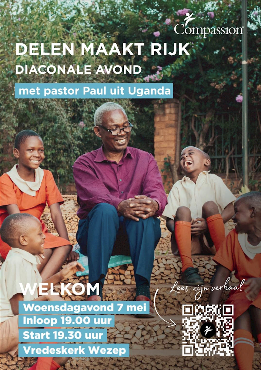 ![]() Bericht van 24 oktober 2025 Sponsorkinderen Compassion U heeft er waarschijnlijk wel iets van meegekregen, de Compassion-avond met het indrukwekkende verhaal van Pastor Paul uit Uganda. Een avond waarop de diaconie de aankondiging deed om 2 Ugandese jongeren via Compassion te gaan sponsoren. Het gaat om Nakiru, een meisje en Francis, een jongen. Beiden zijn geboren in 2011. Dankbaar kunnen we u nu vertellen dat vervolgens nog 8 gemeenteleden kindsponsor werden, zodat we inmiddels 10 Ugandese kinderen uit het project van de pastor sponsoren. We zullen u op de hoogte blijven houden van het wel en wee van deze kinderen en hopen uiteraard dat er nog meer sponsorkinderen bij zullen komen. Schrijfambassadeurs gevraagd Een kind sponsoren is uiteraard een kwestie van geld overmaken. Maar daarnaast zou toch ieder kind opbouwende en liefdevolle aandacht moeten ontvangen in zijn/haar leven. Daarom is het zo belangrijk dat de gesponsorde kinderen af en toe iets van ons horen, zodat ze weten en voelen dat ze geliefd zijn en niet vergeten worden. Sommige sponsoren willen alleen financieel bijdragen en voelen er minder voor om te schrijven. Om te voorkomen dat er sponsorkinderen zijn die geen post krijgen, zijn we op zoek naar schrijfambassadeurs voor Compassion. Vind u het leuk om af en toe een (digitale) brief of kaart te sturen naar kinderen zoals Nakiru, Francis of andere kinderen uit Uganda? Meld u dan aan! Er zijn mooie, goed bruikbare voorbeeldbrieven en kaarten op de site van Compassion aanwezig, dus u hoeft het wiel niet zelf uit te vinden. Meer weten? Kijk dan op: https://www.compassion.nl/kom-in-actie/word-vrijwilliger/schrijfambassadeur-worden/ Wilt u zich aanmelden of heeft u andere vragen over sponsoring? Neem dan gerust contact op met Gerjan Stouwdam (06-50258958) of Jetske van Loo (06-10300854). Bericht van 8 mei 2025 Een verslag van een indrukwekkende avond! Pastor Paul deelde zijn aangrijpende verhaal over hoe hij een schietpartij en een periode van mishandeling en honger tijdens gevangenschap overleefde en hoe dit leidde tot de keuze zijn verdere leven in dienst van God te stellen. Met de Full Gospel Church bereiken ze inmiddels honderden kinderen – de armsten van de armsten – met onderwijs, voedsel en liefde. Met als doel: de vicieuze cirkel van armoede doorbreken. Door het werk van de Full Gospel Church en met steun van Compassion krijgen deze kinderen tussen de 3 en 9 jaar een kans op een hoopvolle toekomst. Velen ontworstelen zich van hun bestaan in de sloppenwijken en groeien op als personen die verantwoordelijkheid kunnen dragen. Ze halen hun diploma. Daarvoor konden ze nog niet lezen en schrijven. Enkelen werden zelfs advocaat of rechter. Pastor Paul benoemd dat dit vooral mogelijk is door de hulp van Compassion en de giften van de mensen uit (de kerken in) Nederland. Hij ziet hierin duidelijk de leiding en liefde van God. Het was een zegen om zijn verhalen te mogen horen! Aansluitend werden er nog vragen beantwoord. Aan het eind van de avond maakte de diaconie bekend dat zij twee sponsorkinderen gaan ondersteunen. Het gaat om Francis, een jongen en Nakiru. Beiden geboren in 2011. Ook een aantal aanwezigen heeft besloten een kind uit het Ugandese project van Pastor Paul te gaan sponsoren. We hopen en bidden dat dit aantal nog verder mag groeien, zodat we een flinke bijdrage kunnen leveren aan dit hoopvolle project. Aanstaande zondag wordt er in de Vredeskerk, Hoeksteen en Dorpskerk gecollecteerd voor het project. Heeft u vragen, bent u geïnteresseerd in het sponsoren van een kind of wilt u op andere wijze een bijdrage leveren, neem dan contact op één van de diakenen Fred Lugthart (06-19331479), Gerjan Stouwdam (06-50258958), Clarisse Kwakkel (06-29221576) of Jetske van Loo (06-10300854). Meer weten over Compassion —> https://www.compassion.nl/wat-we-doen/ Het verhaal van pastor Paul in de Vredeskerk is hier terug te zien of klik op onderstaande afbeelding. ![]() Bericht van 27 april 2025 Diaconale avond ‘Delen maakt rijk’ In samenwerking met Compassion en Pastor Paul uit Uganda Op woensdagavond 7 mei a.s. organiseert de gezamenlijke diaconie van de Vredeskerk, Hoeksteen & Dorpskerk een interessante diaconale avond in samenwerking met Compassion. Op deze avond is Pastor Paul Kintaama uit Uganda in Wezep te gast. Hij zal de aanwezigen vertellen over zijn bijzondere werk vanuit de door hem gestichte Full Gospel Church en het aan de kerk verbonden Compassion-project. Levensveranderend werk met grote impact. Vertaling is aanwezig. Ook medewerkers van Compassion zullen deze avond aanwezig zijn en vertellen over de projecten van Compassion en kindsponsoring in Uganda. Vanaf 19.00 uur is er inloop met koffie/thee, de avond start om 19.30 uur. Aanmelden? Ja, graag. Telefonisch bij Clarisse Kwakkel (06-29221576) of Fred Lugthart (06-19331479) of door te mailen naar diaconie@hervormdwezep.nl. Iedereen is van harte welkom en neem ook gerust iemand mee. ![]() (Afbeelding van de flyer die werd verspreid.) Bekijk hier het verhaal van pastor Paul of klik op de afbeelding hierboven. | ||
